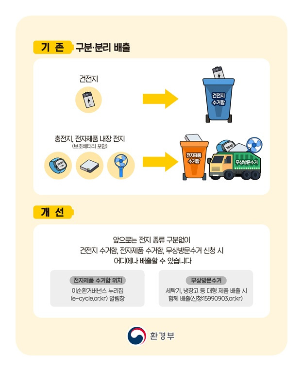 이제 전지를 따로 구분할 필요 없이 가까운 수거함에 편리하게 배출하면 됩니다 😊