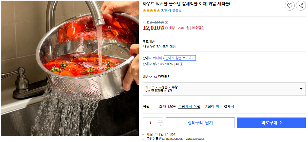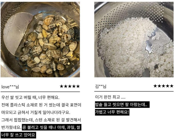 - 특징: 올스텐 + 타공 설계 + 멀티용도 (쌀, 과일, 채소, 면 등)
