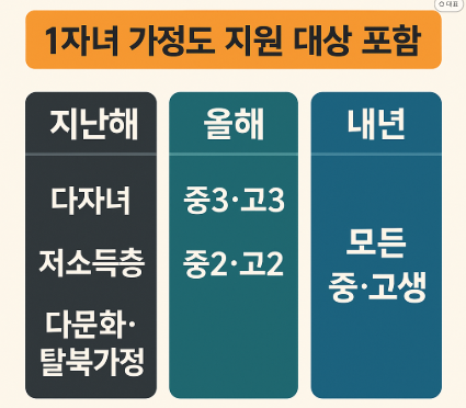 - 2024년(시행 첫해): 중3·고3 학생 중 다자녀(2자녀 이상), 저소득층(중위소득 120% 이하), 다문화·탈북가정만 지원