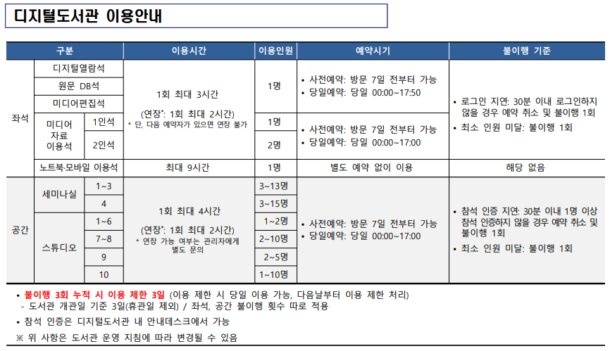 - 디지털 열람석 & DB석: 문서 작업, 전문 DB 열람, 멀티미디어 감상용
