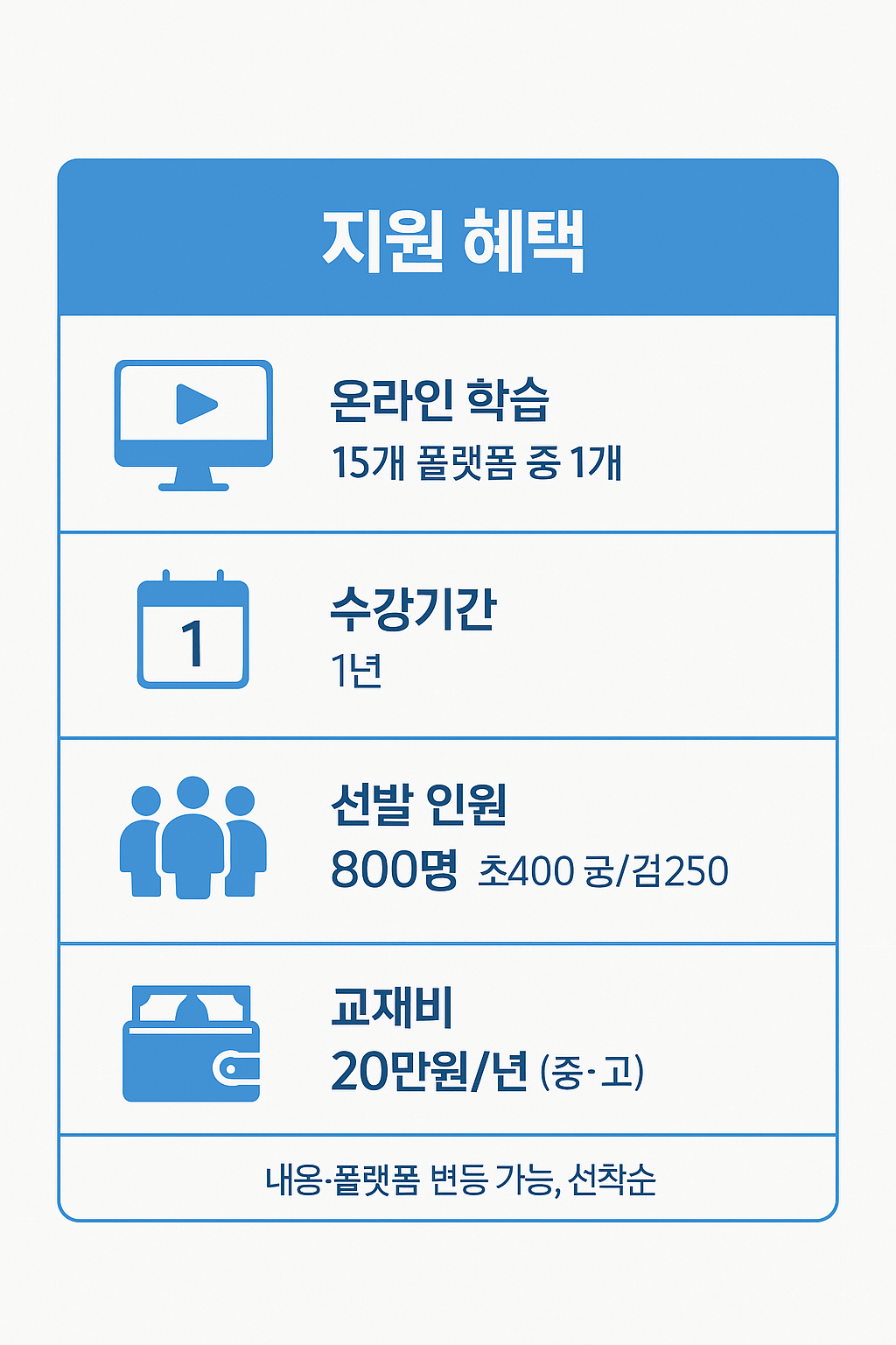 - 중·고등학생 대상 연간 20만 원 상당 교재비 지원