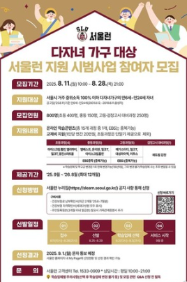 - 정책명: 다자녀 가구 '서울런' 무상 지원 시범사업