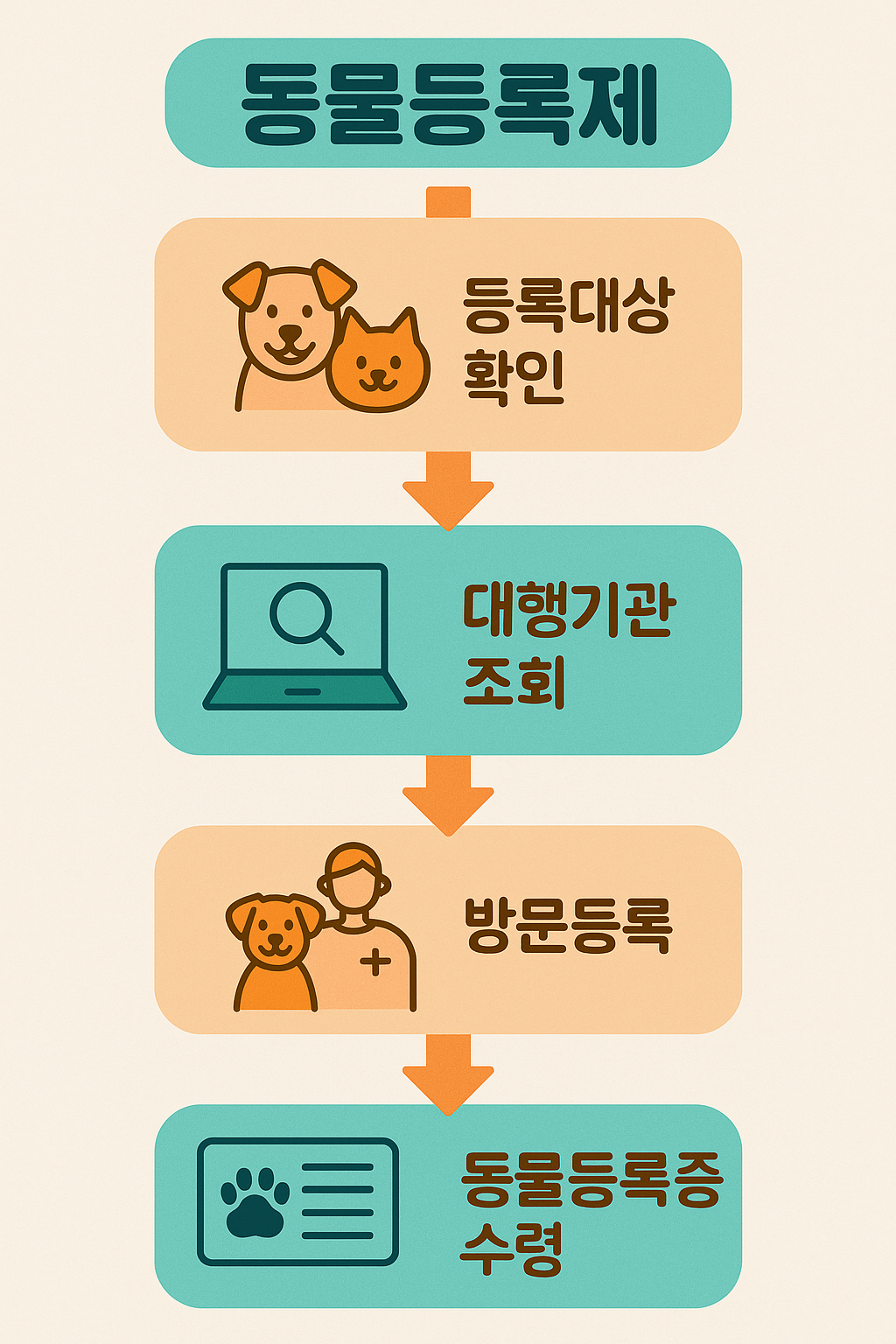 - 등록 방법: 동물병원 등 등록 대행기관 방문 → 내장형(마이크로칩) 또는 외장형(목걸이 인식표) 등록