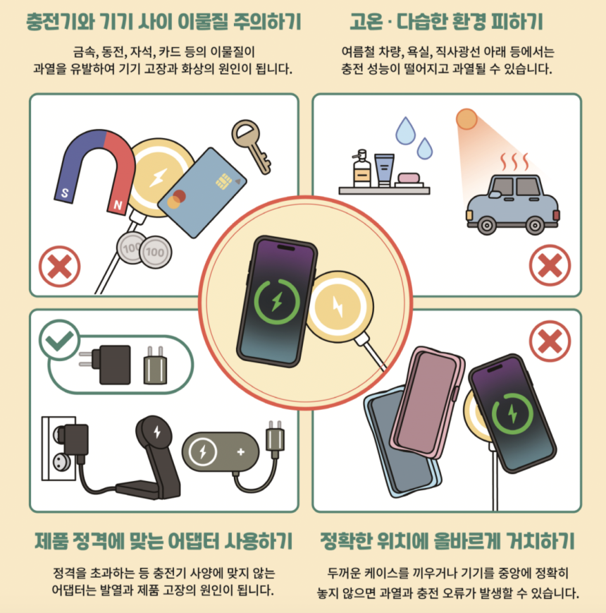 무선충전기는 편리하지만, 잘못 사용하면 위험할 수 있습니다. 오늘 소개한 안전 수칙 4가지 꼭 기억해 주세요!
