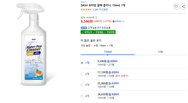 DASH 워터팝 물때 클리너 750ml는 평소 청소로 놓치기 쉬운 물때를 쉽게 제거하고, 표면을 깨끗하고 반짝이게 만들어 줍니다. 광택 회복 효과와 용량 대비 가격 메리트도 좋아서 사용 빈도가 높은 욕실, 샤워부스, 싱크대 등에 하나쯤 꼭 비치해 두면 좋을 제품입니다. 깨끗한 욕실에서 상쾌함을 느끼고 싶다면 선택으로 후회 안 할 아이템이에요!