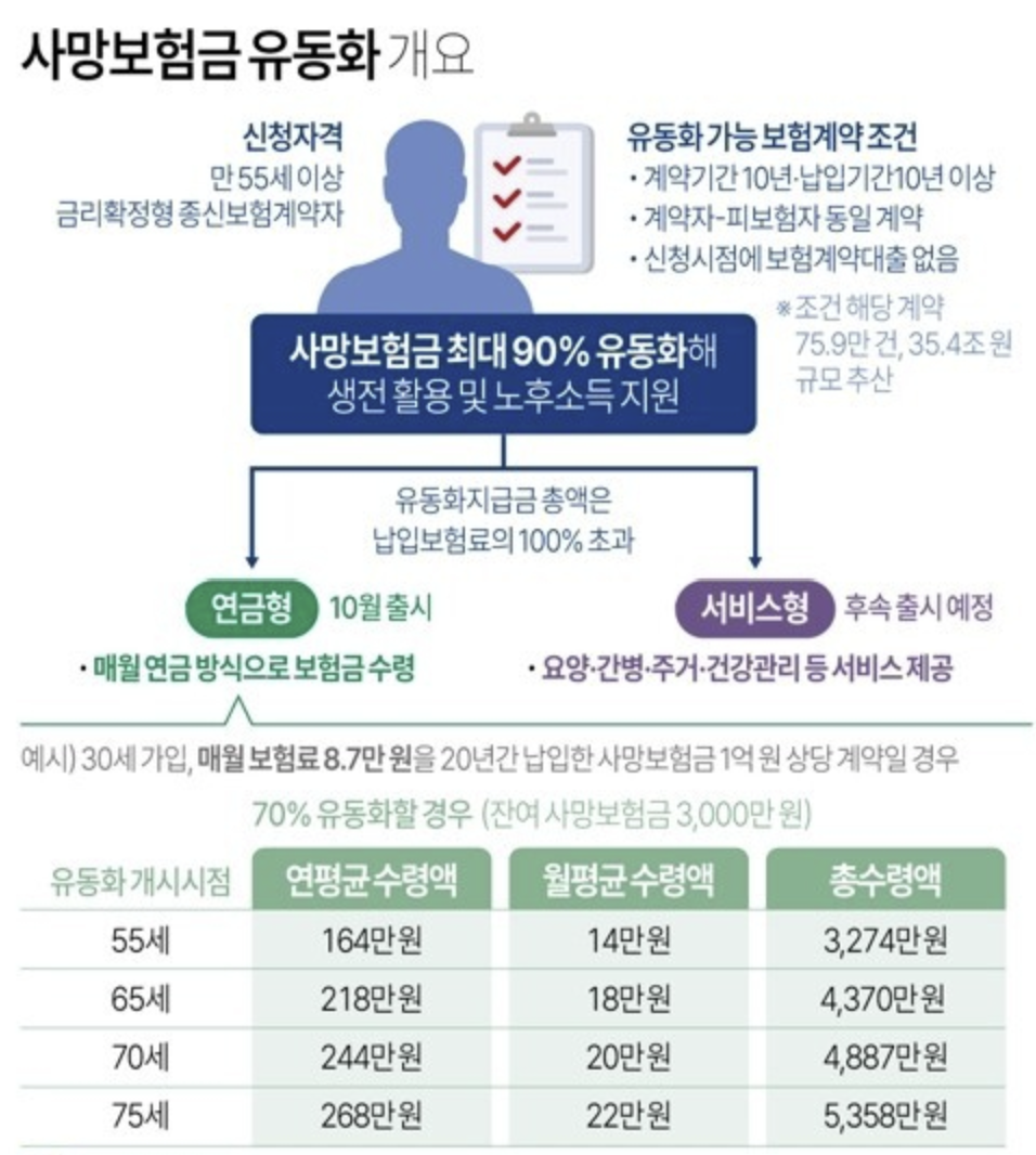 사망보험금 유동화는 기존 종신보험의 사망시 지급 구조를 바꿔 생애 현금흐름으로 전환해 주는 장치입니다. 고령층의 노후소득 보완, 예상치 못한 의료·돌봄 지출 대응 등 생활 안정에 도움을 줄 수 있어요. 정부·금융권은 이 제도를 바탕으로 다양한 서비스형 보험을 확대할 계획입니다.