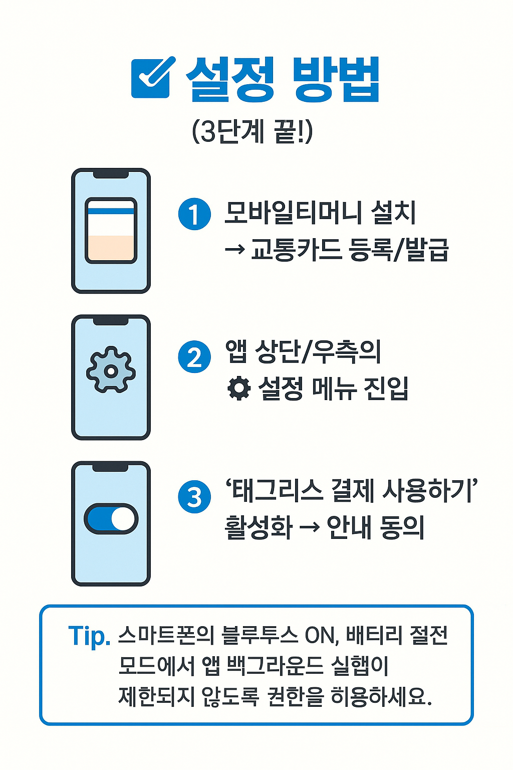 - 모바일티머니 앱에서 교통카드 등록 후 ‘태그리스 결제 사용하기’ 활성화