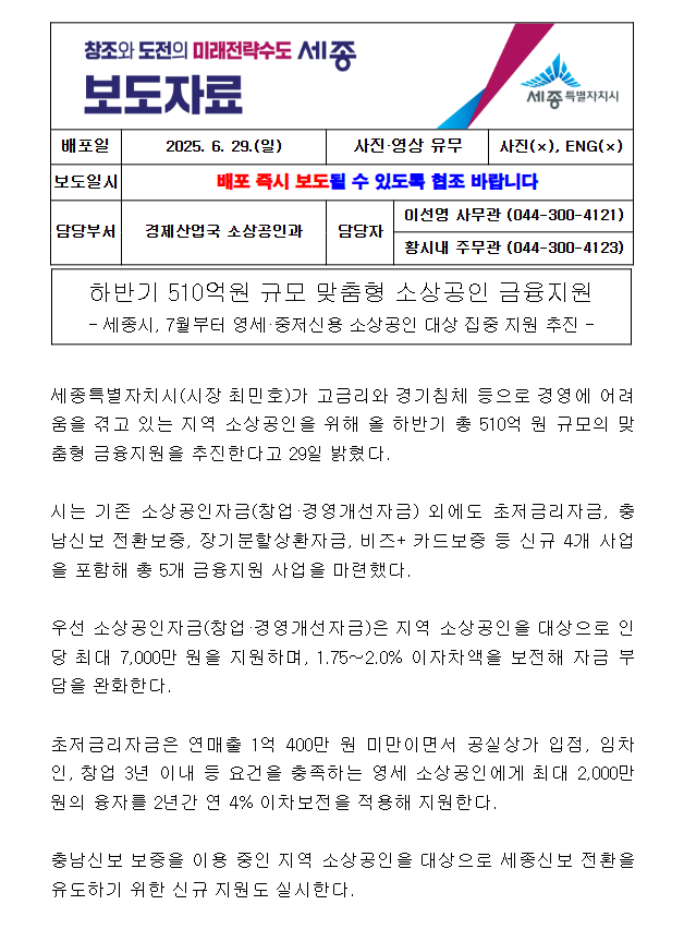 • 정책명: 2025년 세종시 소상공인 맞춤형 금융지원