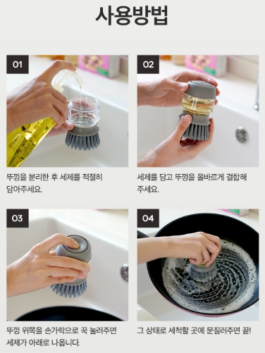 - 손잡이를 잡고 솔로 닦으면서 상단 버튼을 톡 누르면 세제 자동 분사!