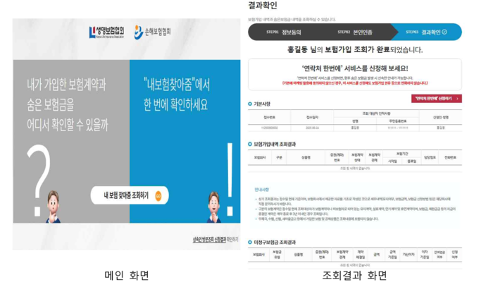- “내 보험 찾아줌(https://cont.insure.or.kr)” 접속 → 가입 보험 계약, 숨은 보험금 내역 조회