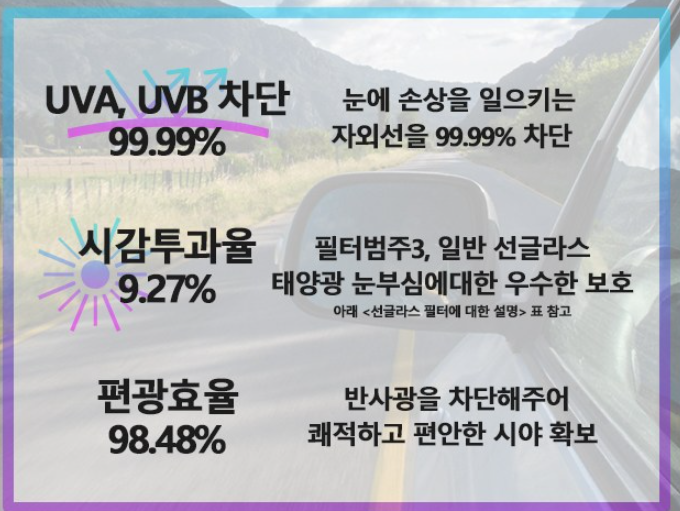 - UVA, UVB 자외선 99.99% 차단 – 눈에 손상을 주는 유해 자외선을 거의 완벽하게 차단