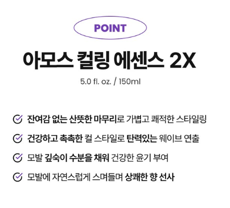 아모스 컬링 에센스는 이러한 요소를 모두 포함해 모든 모발 케어를 한 번에 해결할 수 있도록 설계되었습니다.