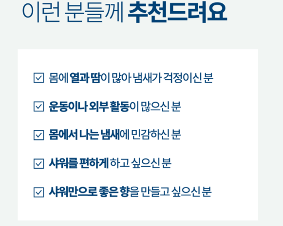 • 여름·덥고 습한 환경에서 멘톨 느낌이 과하게 느껴질 수 있으므로 사용량 조절하거나 물 온도를 낮춰서 사용 추천