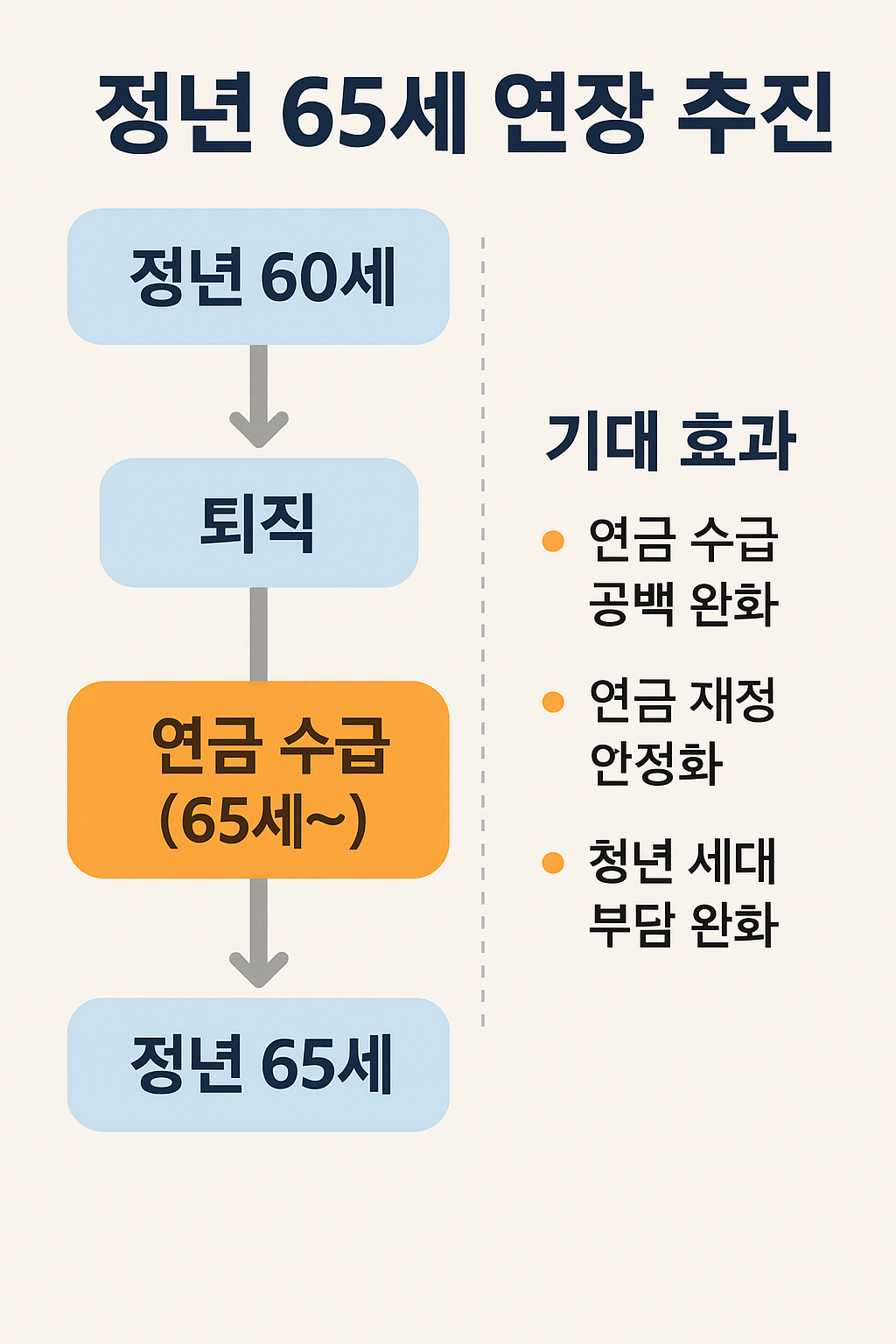 현재는 60세에 퇴직해도 국민연금 수급은 65세부터 가능해 5년 간 소득 공백이 발생합니다. 정년이 65세로 연장되면 이 공백 없이 연속된 소득이 가능해져, 노후 준비가 훨씬 수월해지죠.