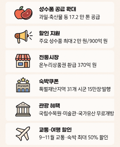 정부는 추석 민생안정 대책을 통해 국민 생활비 부담을 낮추고 지역경제 활력을 높이기 위해 역대 최대 규모의 성수품 공급, 대대적인 할인 행사, 교통비 경감, 관광 지원책을 추진합니다.