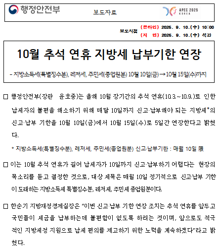 정리하자면, 10월 추석 연휴로 인해 지방세 납부기한이 10월 15일(수)까지 연장됩니다.