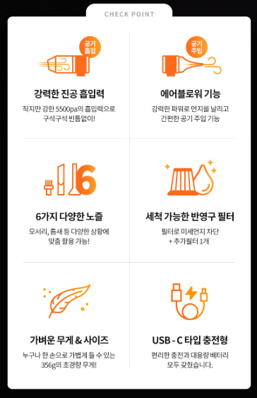 - 틈새 먼지, 털, 모래 등 세심한 청소가 필요한 분