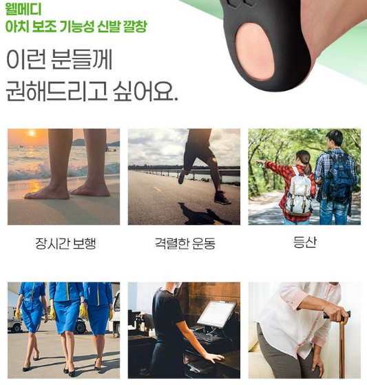 웰메디 아치 보조 기능성 깔창은 인체공학적 아치 지지 설계로 충격을 분산시키고 발의 자연스러운 움직임을 도와주는 실용적인 솔루션입니다.