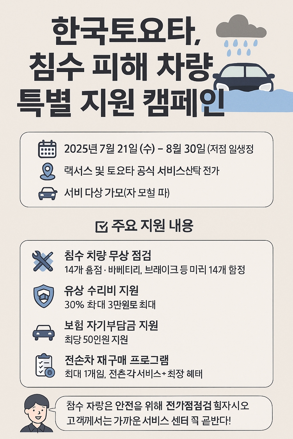 2025년 여름, 중부지방을 중심으로 기록적인 집중호우가 발생하면서 차량 침수 및 파손 사고가 잇따르고 있습니다. 이런 가운데 한국토요타자동차는 고객 피해를 최소화하고 빠른 복구를 돕기 위해 침수 피해 차량 특별 지원 캠페인을 긴급 실시합니다.