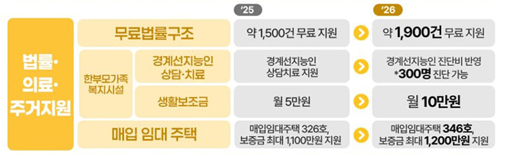 - 법률·의료·주거 지원 확대