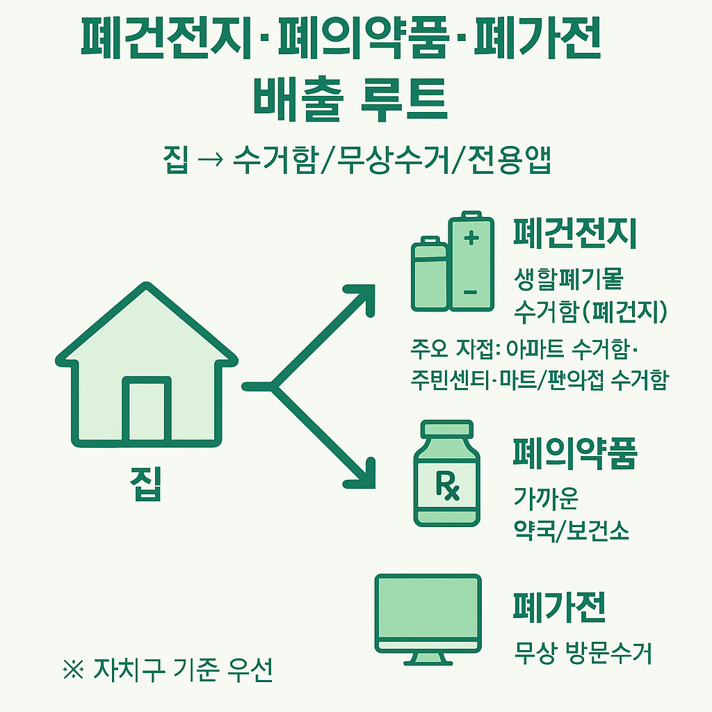 - 다만 폐건전지·폐의약품·폐가전은 무조건 전용 경로로!