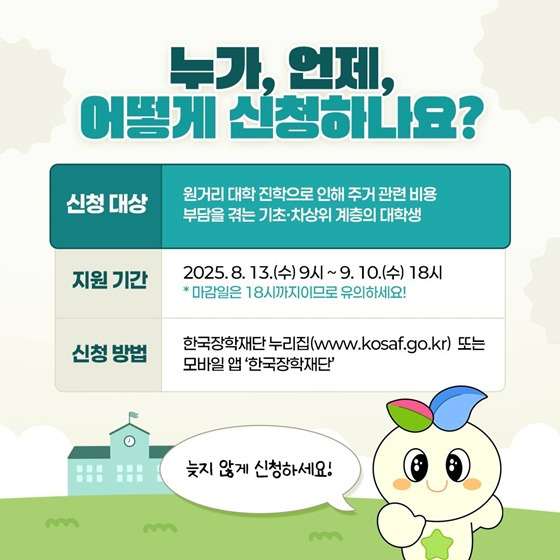 혹시 원거리 통학 때문에 매달 큰돈을 주거비로 쓰고 계신가요? 그렇다면 이번 주거안정 장학금 꼭 신청하세요! 😊