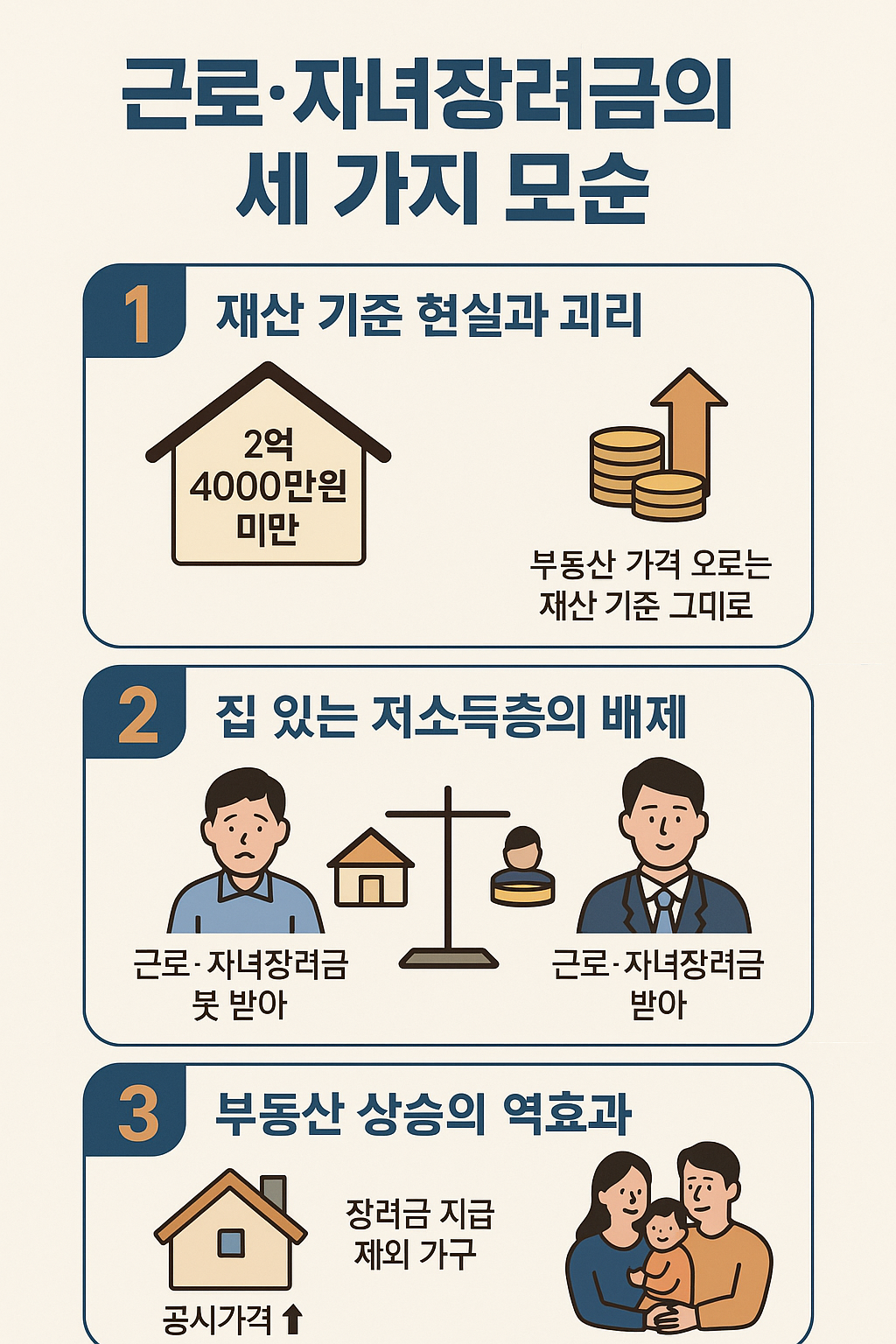 근로·자녀장려금 제도는 분명 많은 가구에 도움이 되고 있습니다. 하지만 “집값 때문에 장려금을 못 받는” 현실은 개선이 필요합니다.