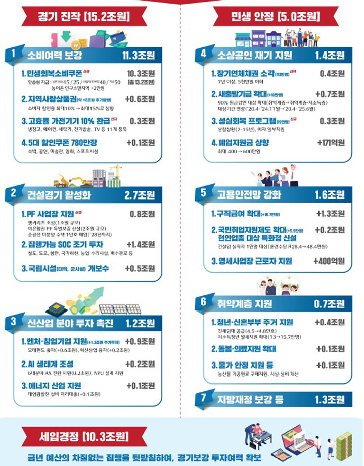 - 전 국민 소비쿠폰 지원 (1인당 15만~50만 원, 국비 10조 3,000억 원)