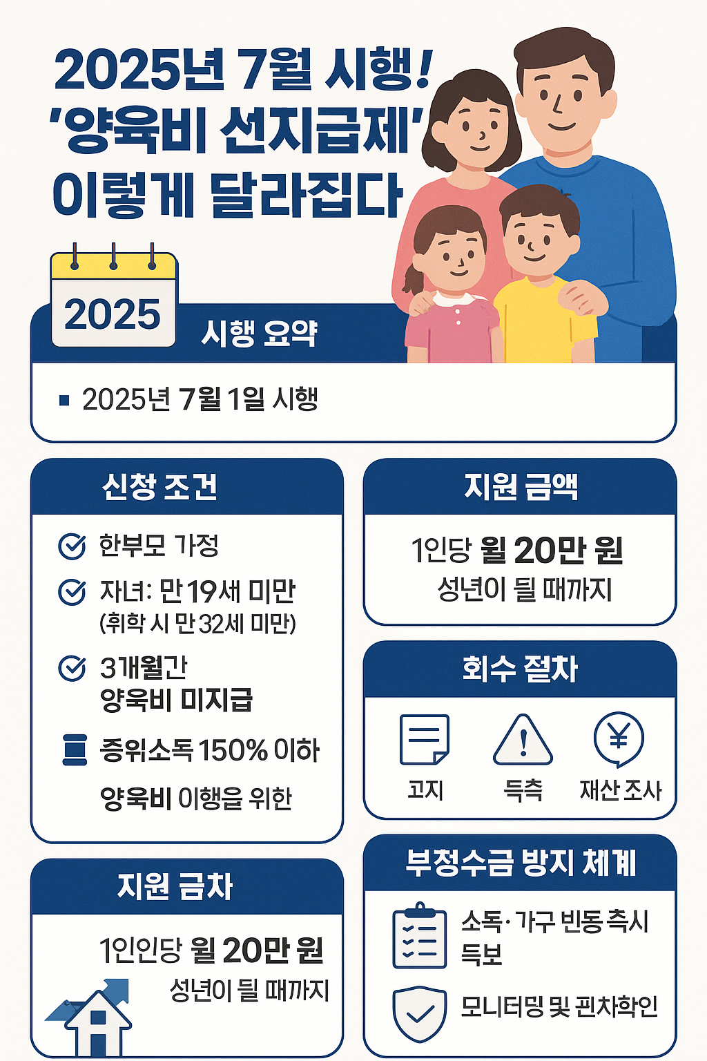 그동안 양육비를 제대로 받지 못해 생계에 어려움을 겪은 한부모 가정 많으셨죠. 드디어! 정부가 양육비를 먼저 지급하고 나중에 미지급자에게 회수하는 ‘양육비 선지급제도’가 오는 2025년 7월부터 본격 시행됩니다.