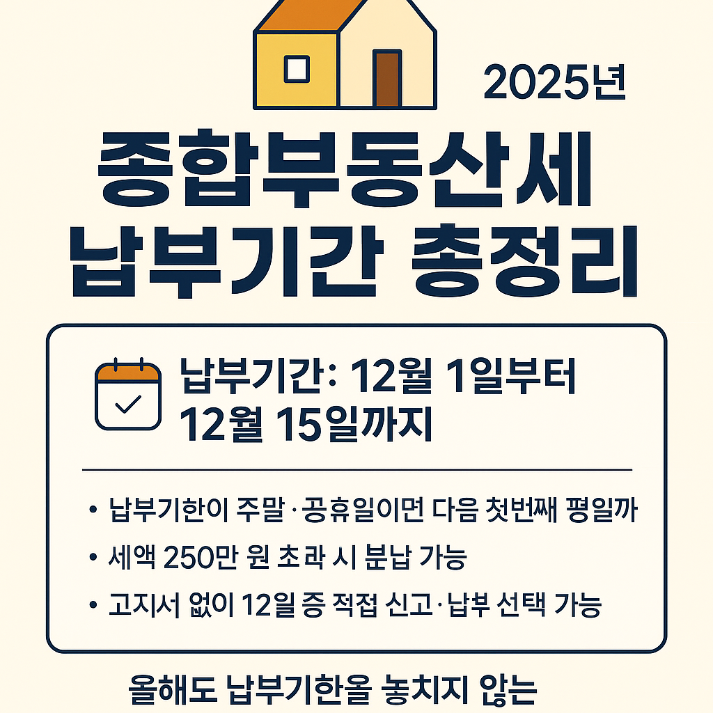 2025년에도 종합부동산세 납부기한은 12월 1일부터 12월 15일까지입니다.