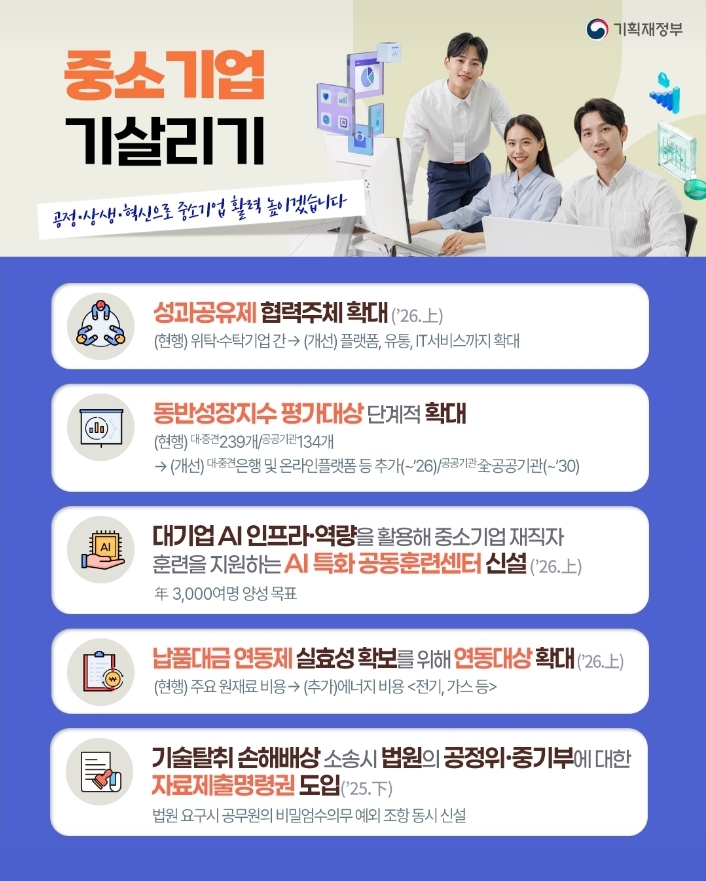 이번 대책은 협력, 공정, 혁신을 중심으로 ▲성과 공유, ▲동반성장 촉진, ▲AI 인재 양성, ▲납품대금 연동제 강화, ▲기술탈취 방지 등 다각적 지원책을 담고 있습니다.